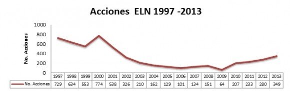El último momento que vive el ELN se gesta en el cuarto congreso de esta guerrilla, que tuvo lugar en el año 2006. Allí se dio preponderancia a la promoción de una “fuerza política de masas” y reconocieron la postura que a través del acceso a posiciones de poder se puede transformar el Estado desde adentro. Desde el año 2009 ha iniciado un proceso de recuperación, que si bien no alcanza los niveles que tenía en el 2000, ni puede ser comparada con la dinámica de confrontación de las FARC, muestra que el cambio de táctica del ELN ha llevado a un repunte en el número de acciones de esta guerrilla generando impactos en los territorios donde tiene presencia. La siguiente gráfica muestra la evolución de las acciones armadas entre 1997 y el año 2013.