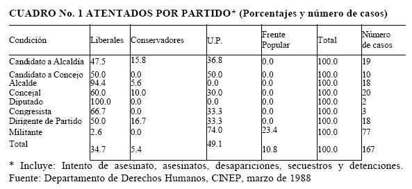 La violencia política se recrudeció de manera significativa en los dos meses anteriores a los comicios de marzo. Aunque en términos globales, la Unión Patriótica ha sido el movimiento más afectado por la escalada de crímenes políticos, todos los partidos fueron víctimas de esta especie de guerra sucia». El número de candidatos a las alcaldías asesinados hasta diciembre de 1986, once en total -seis de la UP, cuatro del socialconservatismo y uno del Partido Liberal-, en marzo se elevaron a 21 con la eliminación de cinco más de la UP y cuatro liberales. Así lo señalan las cifras presentadas y los cálculos realizados por el Departamento de Derechos Humanos del CINEP (Cuadro No. l), con los cuales se da cuenta del número de atentados efectuados contra los distintos partidos políticos entre el 1 ° de enero y el 13 de marzo de 1988.