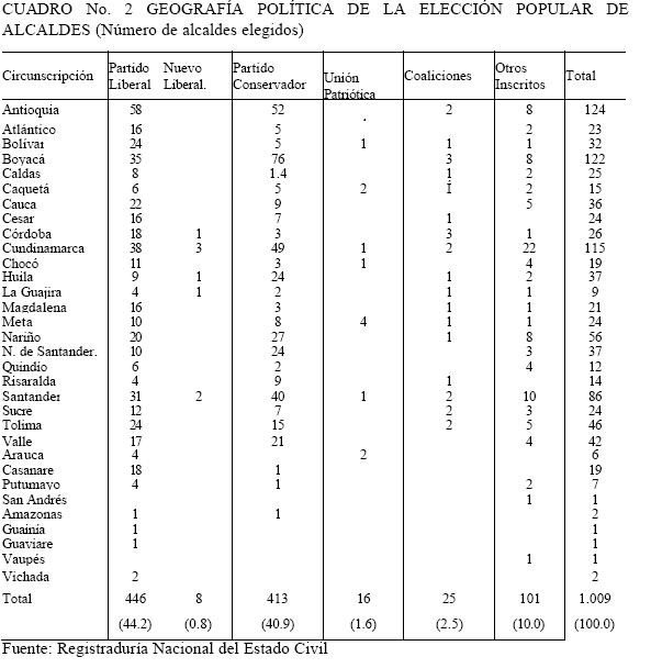 Los resultados que arroja esta primera elección plantean un fenómeno esencial: si bien es cierto que irrumpieron nuevos actores sociales y políticos en distintos municipios y regiones, la presencia y el arraigo local de los partidos tradicionales continúa siendo uno de esos rasgos esenciales del régimen político. La votación por partido para elegir alcaldes en las 32 circunscripciones regionales del país indica, de manera clara, que la geografía política que conocemos de tiempo atrás no varió sustancialmente y tampoco superó, ni mucho menos cumplió con las expectativas que en tal sentido se había planteado con la reforma. Este suceso lo explica el ex ministro Jaime Castro como la muestra clara de la lucha que se dio entre la clase política regional para no dejarse quitar el poder en sus departamentos por su rival y tampoco permitir el asentamiento de uno nuevo.