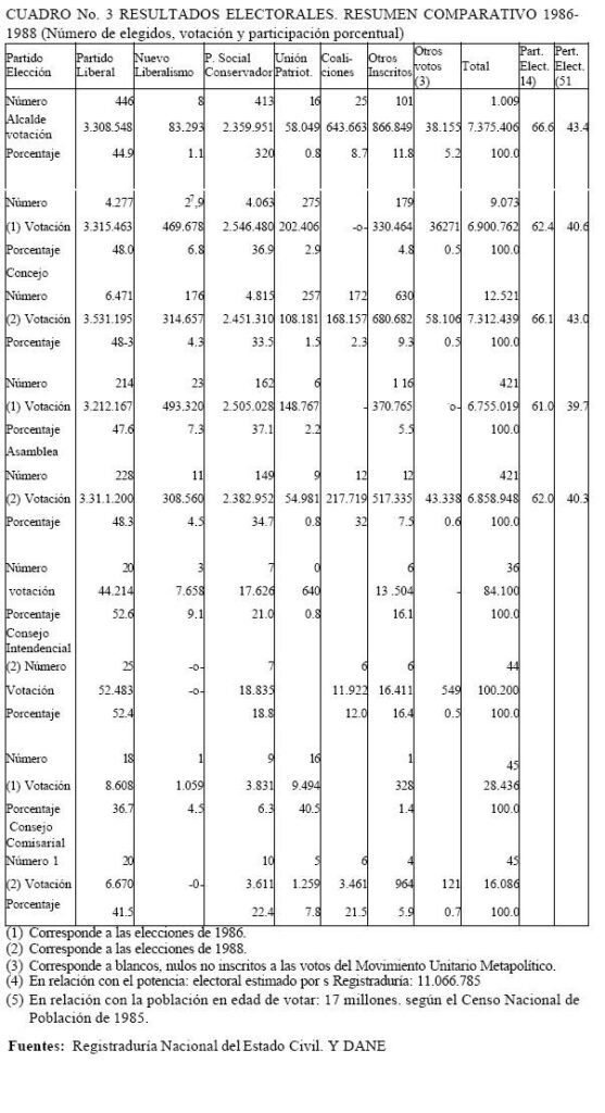Cuando se inicia la correría electoral de quienes ostentaban el poder regional, para hacerse electoralmente a los municipios de los departamentos que controlaban, de forma paralela desde finales de 1986, cuando se iniciaron las campañas electorales, un total de 140 alcaldes y concejales en ejercicio, candidatos a las alcaldías y concejos, consejeros intendenciales, comisariales y diputados, fueron asesinados. De ellos, 50 eran de filiación liberal, 46 pertenecían a la Unión Patriótica y 39 al Partido Conservador. A estas cifras debe sumarse la lista de muertes aún en la impunidad de cerca de 500 activistas, dirigentes comunales y campesinos que también perdieron la vida en forma violenta.