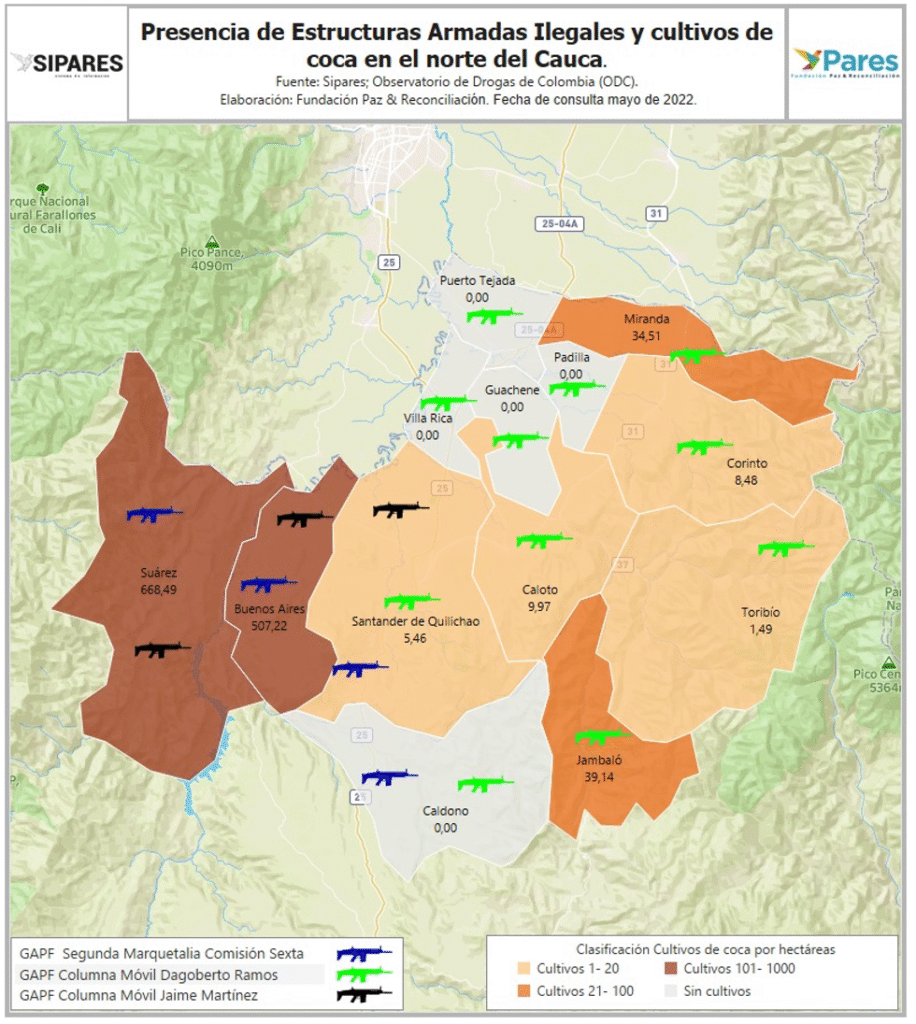 Presencia de Estructuras Armadas Ilegales y cultivos de coca en el norte del Cauca. Imagen de: Fundación Paz & Reconciliación.