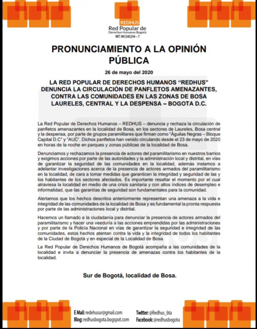 Desde el pasado 23 de mayo comenzaron a circular en los sectores de Laureles, Bosa Central y La Despensa panfletos amenazantes firmados por el Bloque Capital de la Águilas Negras – AUC. Esto en medio de un Estado de Emergencia que ha acentuado las violencias sociales a las que han estado expuestas históricamente las periferias de la ciudad.