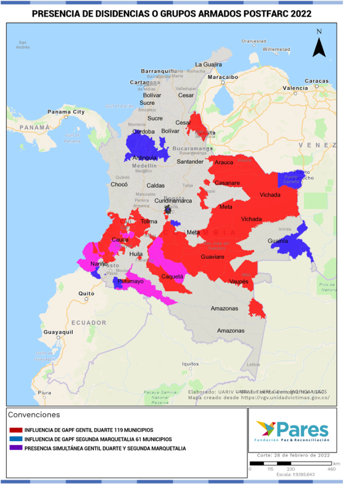 En el informeGrupos Armados Postfarc: una nueva espiral de violencia, Pares describió la forma en la cual las tres líneas de disidencia (Gentil Duarte, Segunda Marquetalia y Dispersos) fortalecían su accionar en distintos territorios del país. Actualmente, los grupos dispersos han desaparecido debido a su integración a alguno de los dos bandos. En el caso del suroccidente, la Segunda Marquetalia, su gran fortín, logró posicionarse como grupo en disputa territorial con el Comando Coordinador de Occidente (Gentil Duarte), generando así un avance significativo para la organización a pesar de los golpes propinados por las confrontaciones con otras estructuras armadas en la frontera de Venezuela con Colombia.