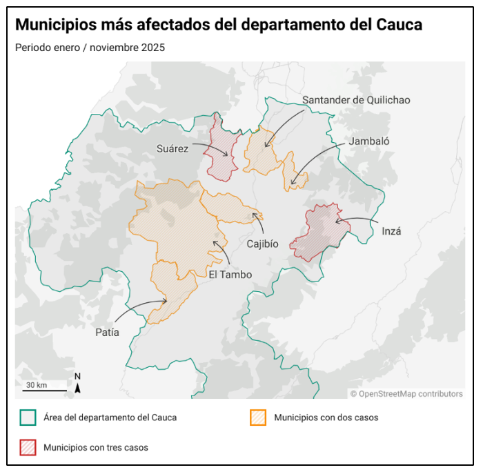 Geográficamente, el conflicto se distribuye siguiendo lógicas territoriales históricas, pero con nuevas expansiones. El norte del Cauca (incluyendo Caloto, Corinto, Santander de Quilichao, Mondomo y Buenos Aires) continúa bajo fuerte influencia del EMC, especialmente de las columnas Jaime Martínez y Dagoberto Ramos, que operan mediante drones, cilindros y ataques urbanos reiterados, aprovechando la conexión hacia Jamundí y el Valle. El sur, encabezado por Patía, Balboa y Mercaderes, es el escenario dominante de la estructura Carlos Patiño, que combina carros bomba, emboscadas a patrullas y ataques a movilidad militar en un corredor clave hacia Nariño y Putumayo. El oriente, especialmente Inzá, Totoró y Tierradentro, exhibe una guerra abierta entre EMC y ELN, con alto impacto civil, confinamientos y una disputa intensa por las rutas hacia el Huila. El Macizo Colombiano (La Vega, San Sebastián, Almaguer) se ha convertido en uno de los ejes más explosivos, con choques continuos, control de cultivos y tensiones por poder local. Argelia, por su parte, es el epicentro de una compleja disputa tripartita, mientras Popayán y sus alrededores experimentan ataques simbólicos que buscan proyectar la presencia y capacidad ofensiva de los grupos armados en entornos urbanos más densos.