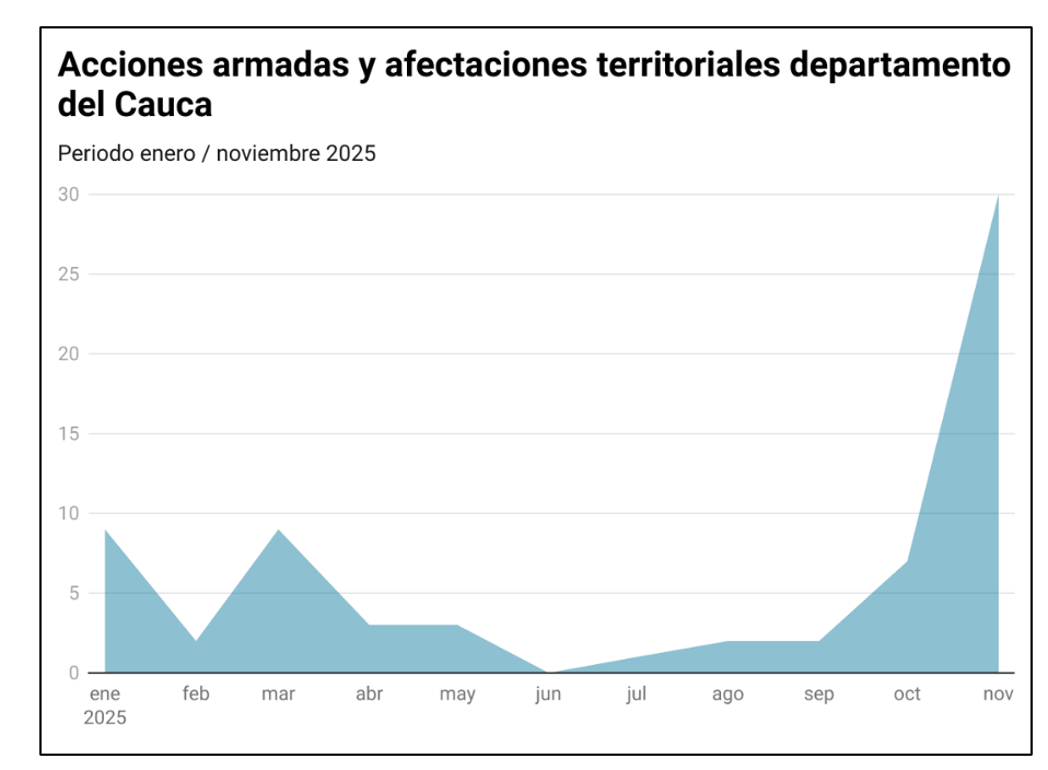 La evolución temporal de la violencia entre enero y noviembre muestra un claro escalamiento. Los primeros meses estuvieron marcados por disputas territoriales entre grupos y los primeros ataques con drones; hacia marzo se intensificaron los explosivos en entornos urbanos y hostigamientos masivos a estaciones; entre abril y mayo aparecieron los métodos de impacto cualitativo, drones combinados con carros bomba y volquetas lanzadoras, para agosto y septiembre los drones se consolidaron como arma permanente del EMC, y el último trimestre del año mostró un pico de violencia con ataques casi semanales, combates prolongados en Suárez, Totoró y El Tambo, y un incremento de afectación civil. Esta progresión evidencia un conflicto no solo en expansión, sino también en transformación táctica rápida, donde la capacidad tecnológica improvisada redefine la dinámica militar.