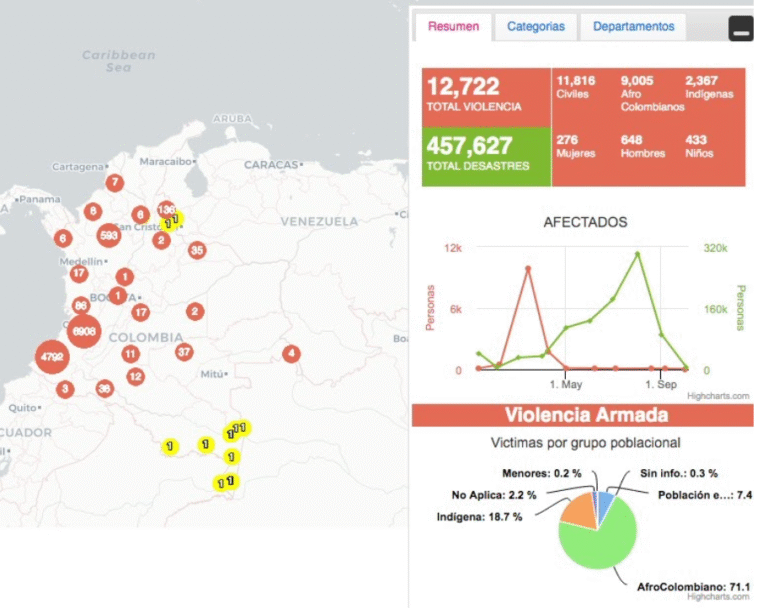 Hay que recordar que, según información del Observatorio de Derecho de los Pueblos, Derechos Humanos y Paz de la ONIC, en lo que va del año, 17.845 personas de comunidades indígenas han sido afectadas por algún hecho victimizante: es decir, en promedio, cada día, casi 60 personas de esta población estarían siendo victimizadas. Además, según la información registrada por laOficina de Naciones Unidas para la Coordinación de Asuntos Humanitarios (OCHA) , el 18.7% de víctimas de la violencia armada (12.722 total) en el país, en lo que va del año, han sido personas indígenas. Por su parte, el 54.7% de los 19.019 ataques contra la población civil han sido contra comunidades indígenas. Asimismo, de las 65.567 personas que han sido desplazadas en lo que va del año, el 16.6% pertenecen a pueblos étnicos.
