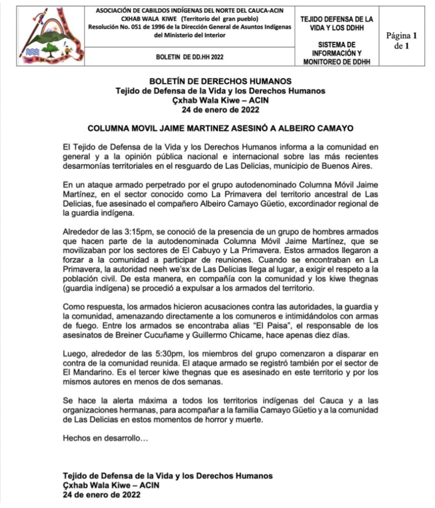 Hoy, de nuevo, las comunidades indígenas denunciaron el asesinato del ex coordinador de la guardia indígena, Albeiro Camayo, en hechos ocurridos en el resguardo de Las Delicias, municipio de Buenos Aires (Cauca). El hecho se presentó en medio de un ataque armado cometido por la Columna Móvil Jaime Martínez. Hay que señalar, que como se denunció desde las comunidades, este grupo llegó al territorio desde cerca de las 3:15 p.m., y este hecho tuvo lugar siendo alrededor de las 6:00 p.m.