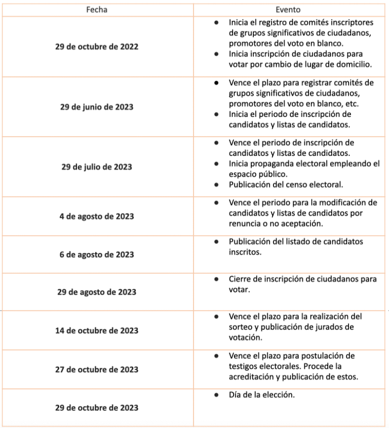 La inscripción de candidatos comenzará el 29 de junio de 2023 e irá hasta el 29 de julio de ese año. El 4 de agosto vencerá el plazo para la modificación de las listas de candidatos. Ese día se conocerán los nombres de quienes definitivamente competirán el 29 de octubre. La propaganda electoral podrá comenzar a circular tres meses antes de la elección, es decir el 29 de julio, la misma fecha en la que la Registraduría deberá publicar el censo electoral.