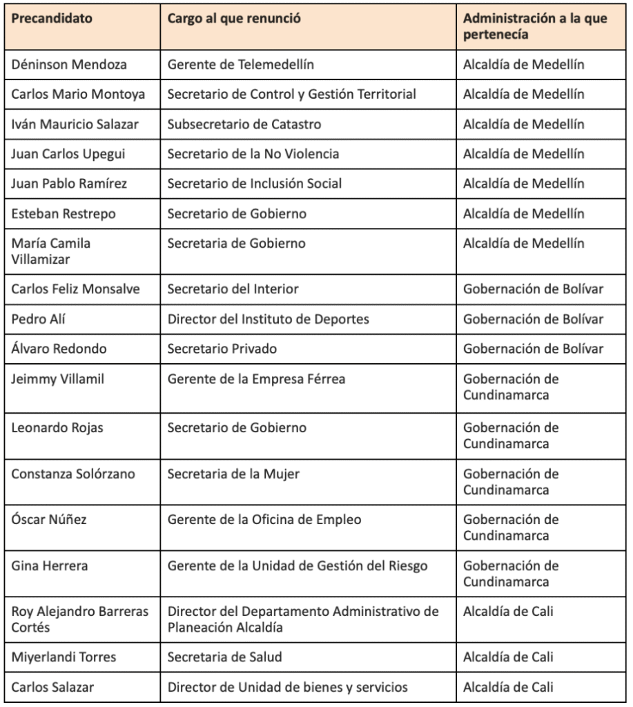 Una cascada de renuncias se ha visto en las últimas semanas en varias de las administraciones municipales y departamentales por parte de aquellos que quieren hacer parte del tarjetón del próximo año.Para no quedar inhabilitados , quienes desean ser candidatos a las elecciones del 29 de octubre de 2023 deben estar por fuera de las administraciones públicas al menos desde doce meses antes de que estas se lleven a cabo. Los funcionarios que han renunciado en sus respectivas administraciones son: