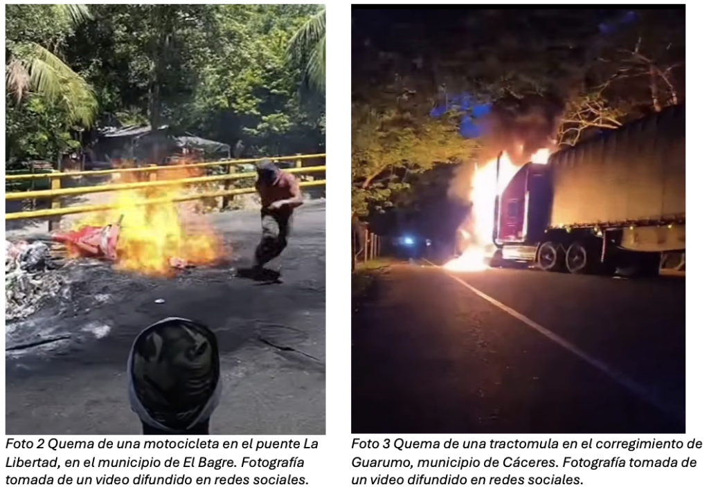 A su vez, el bloqueo de corredores estratégicos ha generado una desconexión territorial que afecta tanto la dinámica regional como los flujos nacionales de bienes y servicios. La interrupción de vías clave ha limitado el transporte de combustible, alimentos, insumos médicos y mercancías, elevando los costos logísticos, restringiendo el abastecimiento y debilitando la actividad económica en múltiples sectores. Puntos neurálgicos como la rotonda de Caucasia, la vía hacia Zaragoza, el puente La Libertad en El Bagre y el sector de Campo Alegre en la Ruta al Mar se han convertido en focos de presión territorial que, en conjunto, configuran un escenario de aislamiento relativo de la subregión.