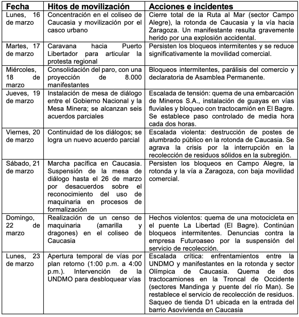 La movilización iniciada el 16 de marzo de 2026, que según el alcalde de Caucasia, Johan Montes, reúne a por lo menos 8.000 mineros, no es un hecho aislado. Responde a una crisis estructural de gobernanza y a un deterioro progresivo de la confianza entre el Estado y el sector minero en el Bajo Cauca, el sur de Córdoba y Valdivia.