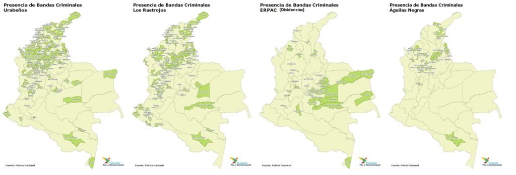 Lo cierto es que en diferentes regiones del país, las bandas criminales hacen o han hecho presencia armada y actualmente representan el mayor riesgo para la ejecución y sostenibilidad de los acuerdos de paz. Las bandas criminales han demostrado a lo largo de los últimos años una alta capacidad de adaptación, las casi 20 mil capturas no han desestabilizado la capacidad de ejercer control territorial. Al contrario, se ha ampliado la oferta criminal, manteniendo el control de las actividades de microtráfico en cabeceras municipales, teniendo control sobre el las actividades relacionadas con la minería criminal, el contrabando, la extorsión y recientemente un aumento progresivo en las amenazas a líderes sociales, defensores de derechos humanos, reclamantes de tierras, organizaciones sociales y líderes de opinión que respaldan el proceso de paz.