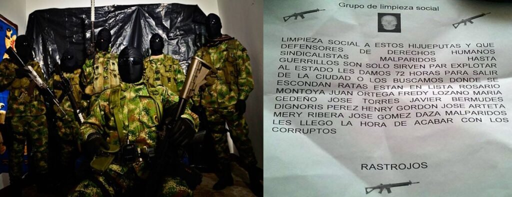 Esta misma situación se ha presentado en ciudades capitales, por ejemplo en la ciudad de Medellín, miembros de las bandas criminales que controlan el negocio del microtráfico y la extorsión y que se han denominado como los herederos de “don Berna” han declarado que todo excombatiente delas FARC que llegue a la capital antioqueña será declarado “objetivo militar”. Hechos que no han sido direccionados únicamente a la posibilidad de asesinar sistemáticamente a los hombres de las FARC que dejen las armas, sino también a líderes de derechos humanos, tal como se puede apreciar en la siguiente foto, el panfleto amenaza
