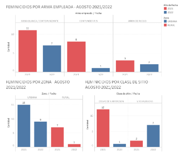El registro total de feminicidios reportados en agosto de 2022 tuvo una disminución de -54,55% con respecto a los reportados en agosto de 2021: 10 casos registrados en 2022 frente a 21 en 2021. Mientras que en agosto de 2021 estos hechos se concentraron en los departamentos de Antioquia (33,3%), Cundinamarca (25%), Cauca y Valle del Cauca (16,67% c/u) y Bolívar (8,33%), para agosto de 2022 los casos se repartieron de manera pareja en Antioquia, Cauca, Cundinamarca, Valle del Cauca y Bolívar (25% c/u). Los municipios que concentran los feminicidios en 2022 son: La Ceja (Antioquia); Cartagena (Bolívar); La Dorada (Caldas); Puerto Tejada (Cauca); Bosconia (Cesar); Villavicencio (Meta); Francisco Pizarro (Nariño); Bucaramanga (Santander); Floridablanca (Santander) y Tuluá (Valle del Cauca).