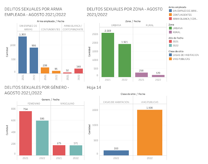 El total de casos de delitos sexuales en agosto de 2022 presentó una reducción de -27,79% con respecto a los reportados en agosto de 2021, esto quiere decir que en agosto de este año se han reportado 786 casos menos que en el mismo mes de 2021 en el que se registraron 2.828 denuncias. Los hechos registrados se concentran a nivel departamental en Cundinamarca (28,6%); Antioquia (13,57%); Valle del Cauca (6,71%); Santander (4,75%) y Bolívar (4,51%). En 2022 estos delitos se repartieron principalmente en las ciudades de Bogotá (60,82% de los casos), Medellín (17,53%), Cartagena (8,38%), Cali (7,6%) y Barranquilla (5,67%). Con respecto a los reportes de agosto de 2021 esto supuso un alto decrecimiento en ciudades como Cali (54,26%) y Medellín (39,82%), un decrecimiento algo menor en Barranquilla (15,38%), y un aumento significativo de los casos reportados en Cartagena (20,37%). Por su parte Bogotá reporta un crecimiento leve (0,85%).