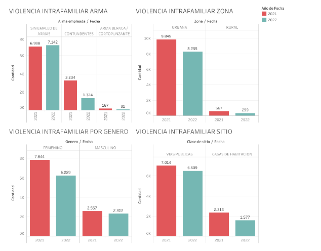 Por otro lado, del 100% de los casos registrados de violencia intrafamiliar, el 96,50% de los casos se concentra en zonas urbanas, frente al 3,50% en zonas rurales. Los sitios que más concentran casos registrados en 2022 son Vías Públicas, que concentra el 76,09% de los caos y Casas de Habitación con el 18,44%. Del 100% de los hechos registrados en 2022, el 83,49% de los casos fueron cometidos sin el uso de armas y el 15,48% con armas contundentes.