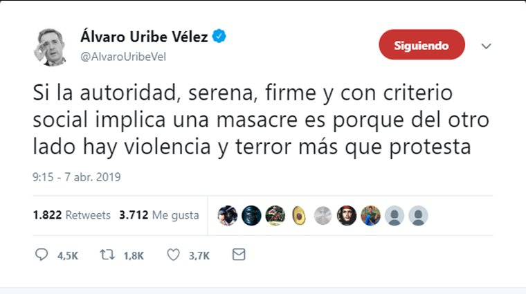 El fin de semana el expresidente Álvaro Uribe Vélez escribió una seguidilla de trinos en Twitter en los cuales parecía justificar la ejecución de una masacre. Sin embargo, hay versiones encontradas: expertos aseguran que, si bien fueron infortunados, no hacen referencia a la apología del odio; otros en cambio aseguran que sí pueden traerle consecuencias legales.