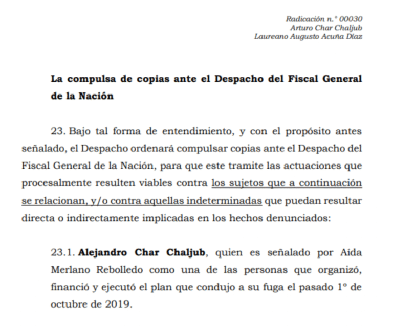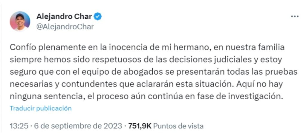 Ante ese parte de tranquilidad que Alejandro Char intenta dar, es válido aclarar que el comunicado de la Corte Suprema, mediante el cual se oficializó la orden de captura, se afirmó que las pruebas son suficientemente sólidas para plantear la necesidad de capturar a Arturo. Además de que, si bien el proceso de investigación continúa, esto se da también por solicitud de la defensa de los Char, quienes solicitaron una ampliación de la indagatoria.