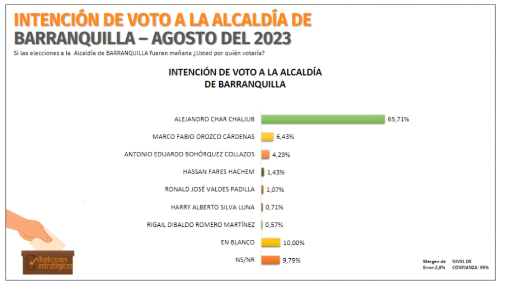 Ahora bien, la firma encuestadora Mediciones Estratégicas, en el estudio publicado a finales de agosto, puso en evidencia que, en efecto, Alejandro Char es el candidato que más acaparó la intención de voto para la Alcaldía de Barranquilla.