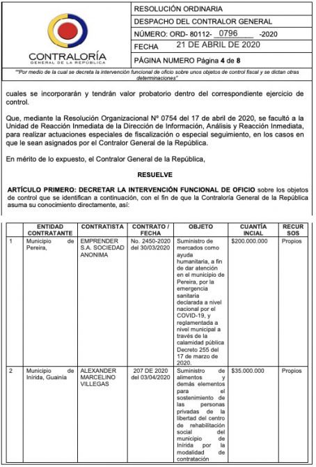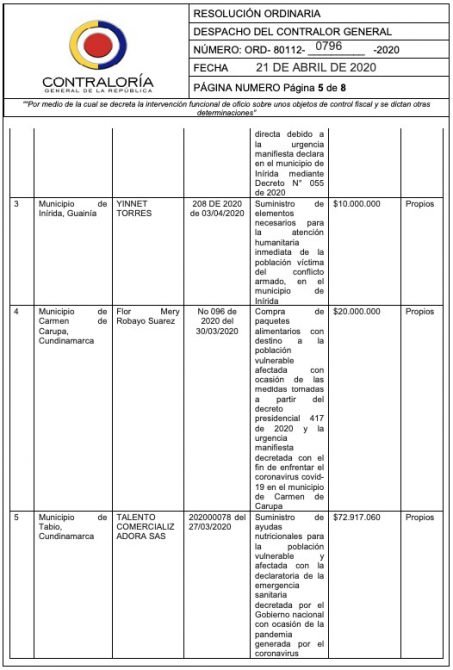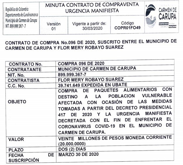 De acuerdo con la resolución ordinaria 80112-0796-2020, la CGR facultada en su control preferente, resolvió la intervención funcional de oficio al contrato No. 096 de 2020 del 30/03 de 2020, entre el municipio de Carmen de Carupa y la contratista Flor Mery Robayo Suárez, por un valor de 20 millones de pesos para la repartición de 400 mercados por un valor unitario de 50 mil pesos. Tanto es así, que el propio contralor general de la nación, Felipe Córdoba, el pasado 24 de abril mencionó especialmente las intervenciones que se hicieron al municipio de Carmen de Carupa .