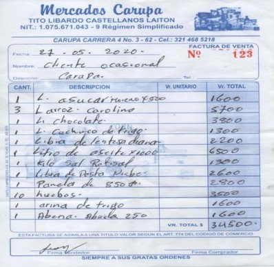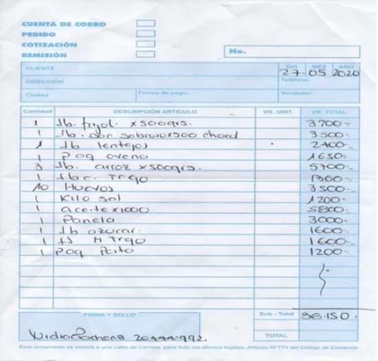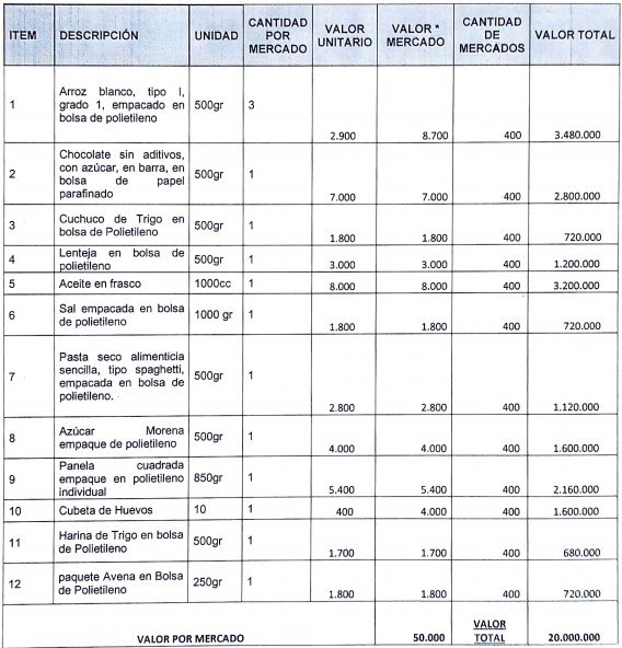 • Sin embargo, Pares tuvo acceso a una solicitud de varios concejales del municipio elevada ante los órganos de control y autoridades correspondientes, en la que se realizó un estudio de mercado haciendo la compra de los 12 ítems en tres (3) supermercados de diferentes marcas, al pormenor, que es más costoso, incluyendo al final de cada cotización los tres impuestos de la contratación (Estampilla del Proanciano, 4%; Estampilla Procultura, 2%; Industria y Comercio, 0,7% y la Retención en la Fuente, 2,5%), los cuales suman un 9,2% adicional por cada mercado.