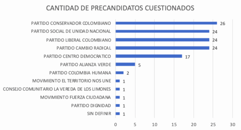 Sin embargo, para las elecciones de 2022, parecen estar desesperados buscando combinar todas las formas de competencia electoral para no perder sus curules. Una vez más, los partidos que tienen en sus huestes a los más cuestionados, son 5 de los 19 partidos con personería jurídica, los cuales concentran el 90% de precandidatos y precandidatas cuestionados. Se trata de los partidos Conservador, La U, Partido Liberal y Cambio Radical.