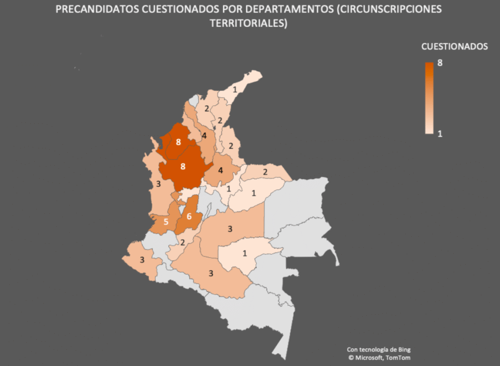 El top 5 de departamentos que concentran la mayor cantidad de precandidatos y precandidatas con cuestionamientos son: Antioquia (8), Córdoba (8), Tolima (6), Risaralda (5) y Valle del Cauca (5). En total, solo estos cinco departamentos concentran el 45% de precandidaturas cuestionadas que están asociadas a una circunscripción territorial para Cámara de Representantes.