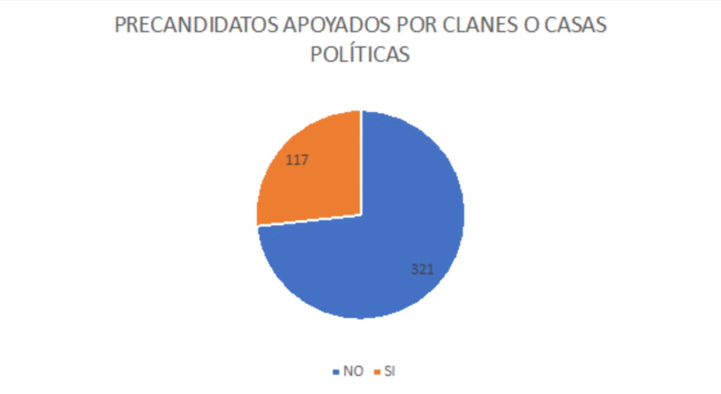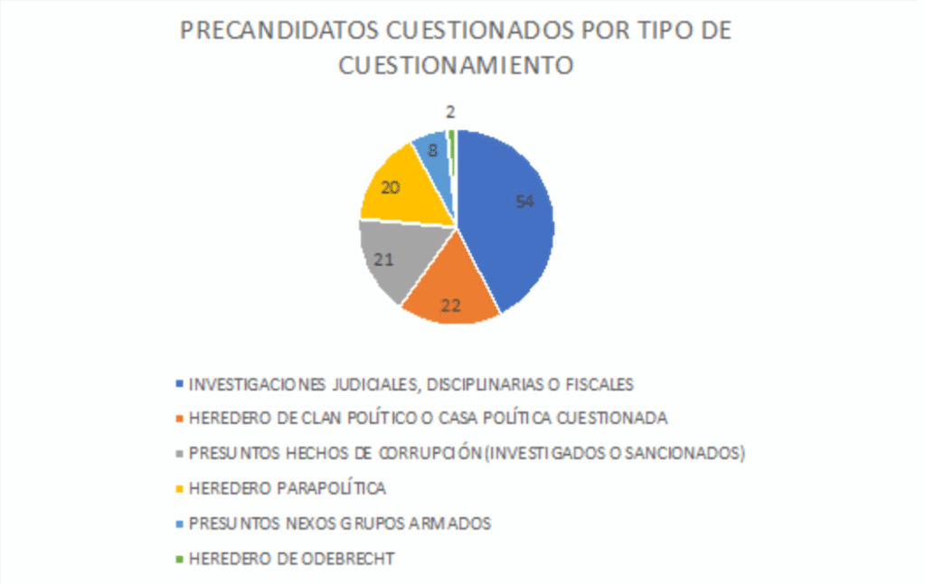 De las anteriores categorías, Pares registró que, de las 127 precandidaturas cuestionadas, en su mayoría (54) cuentan con investigaciones judiciales, disciplinarias y/o fiscales. Unas a causa de investigaciones o denuncias por presuntos hechos de corrupción (21); otras al ser herederos o herederas de clanes o casas políticos con cuestionamientos (22);o por posibles nexos con parapolítica (20); grupos armados organizados (8); o por heredar caudales políticos derivados de Odebrecht (2).