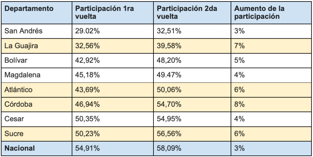La región Caribe fue esencial para la victoria de Gustavo Petro sobre Rodolfo Hernández. El hoy presidente electo se mantuvo líder desde la primera vuelta en los departamentos de San Andrés, La Guajira, Bolívar, Magdalena, Atlántico, Córdoba, Cesar y Sucre. De hecho, para la segunda vuelta logró aumentar su votación en todos estos departamentos, especialmente en La Guajira (+19%), Atlántico (+19%), Bolívar (+16%) y Córdoba (+16%), donde registró sus mayores caudales electorales en la región, lo que llevó indiscutiblemente al aumento de la participación total en las elecciones.