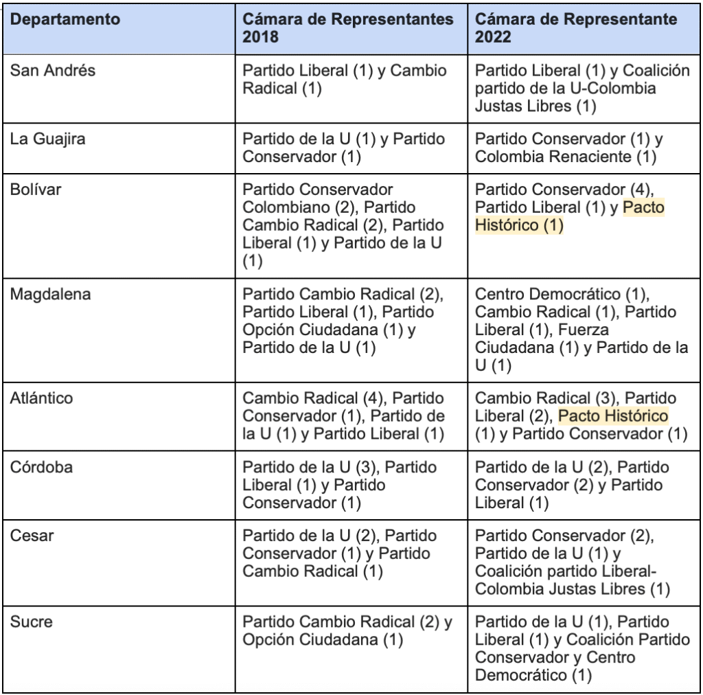 Los resultados de las elecciones legislativas 2022 indican que la fuerza electoral del Pacto Histórico es débil en comparación a la de estos partidos, ya que solamente pudieron lograr dos curules en la Cámara de Representantes en la región Caribe: una en Bolívar y otra en Atlántico, que consiguieron arrebatarle a Cambio Radical y al Partido de la U, respectivamente.