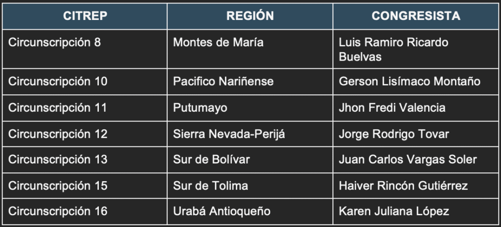 Representantes electos de las CITREP . Elaborado por la Línea de Democracia y Gobernabilidad. Fundación Paz & Reconciliación. Fuente: Registraduría Nacional del Estado Civil.