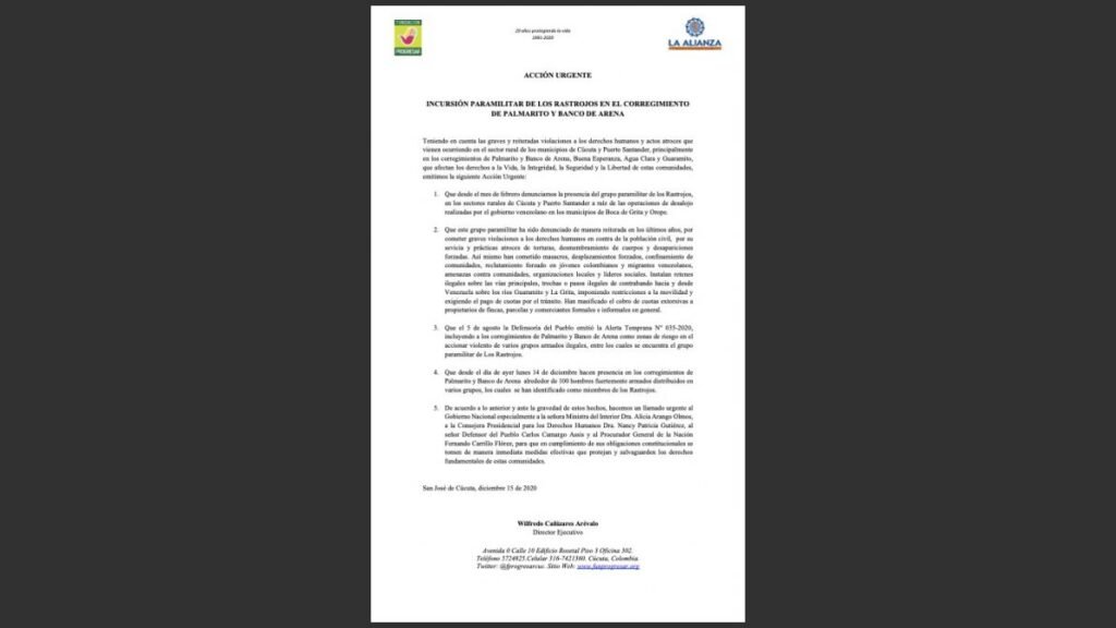 Wilfredo Cañizares, de la Fundación Progresar, a través de una Acción Urgente, alertó ayer que desde el 14 de diciembre de 2020 Los Rastrojos hacen presencia en los corregimientos de Palmarito y Banco de Arena, jurisdicción de Cúcuta, con alrededor de 100 hombres fuertemente armados distribuidos en varios grupos que se han identificado como miembros de esta estructura armada ilegal. Imagen: Cortesía.