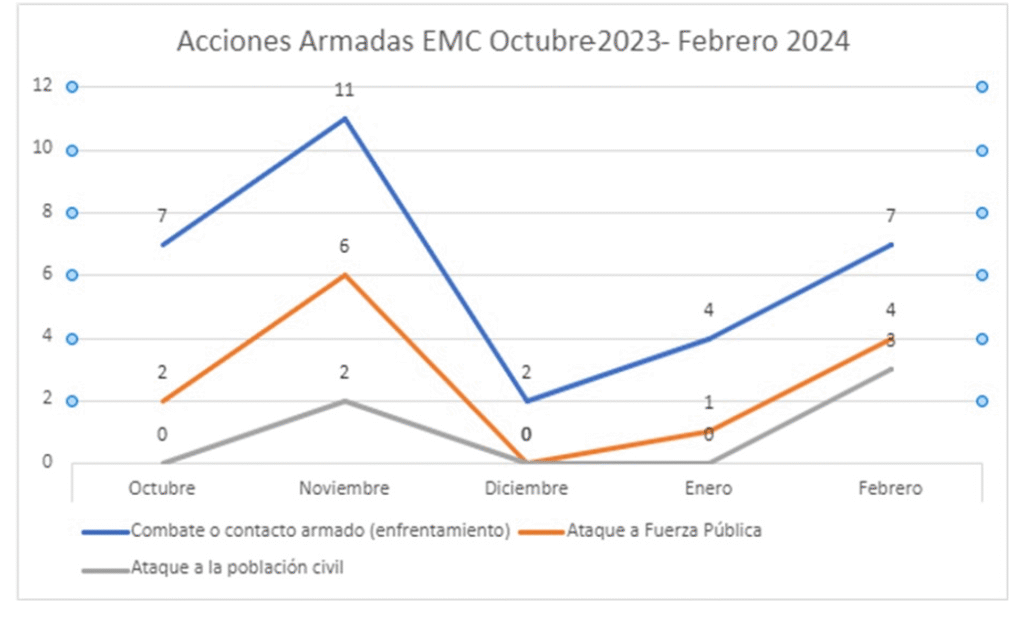 Además, los dos picos de noviembre y febrero, que marcaron un aumento en los enfrentamientos y acciones armadas del Estado Mayor, se relacionan con conflictos territoriales, como los ocurridos en el cañón del Micaí. En febrero, hubo confrontaciones con organizaciones indígenas que están resistiendo las violencias del Estado Mayor. Esta diferencia entre los picos resalta la evolución de la situación. Hasta ese momento, la violencia no se había manifestado con la misma intensidad que en el asesinato de líderes indígenas.