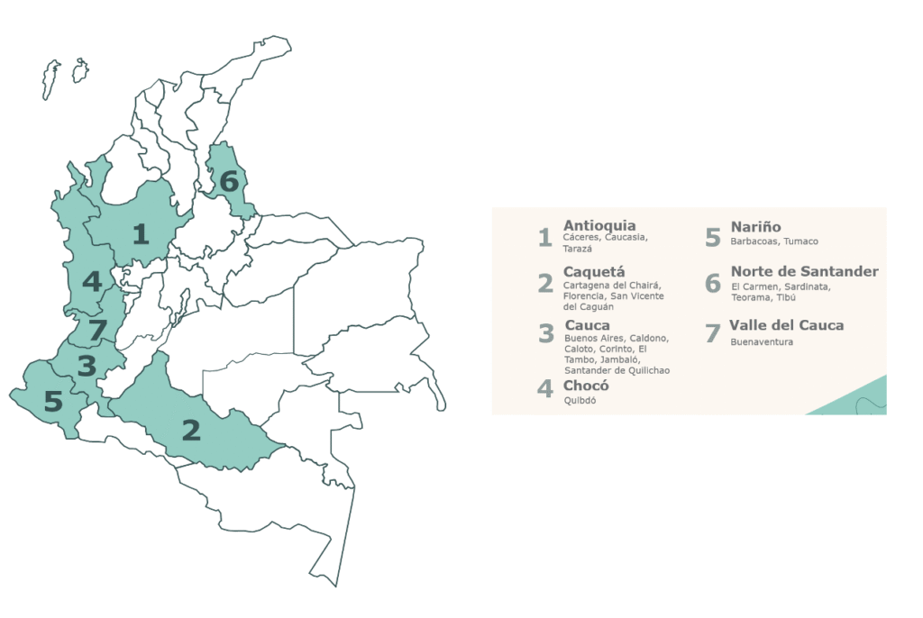 También lo hará en Antioquia, en los municipios de Cáceres, Caucasia y Tarazá, en pleno Bajo Cauca Antioqueño en donde la minería ilegal ha desatado la crudeza de los grupos armados. En el Carmen, Sardinata, Teorama y Tibú, corazón del Catatumbo, territorio minado desde hace 30 años por las guerrillas y los grupos paramilitares. Así como en el Caquetá en los municipios de Cartagena del Chairá, Florencia y San Vicente del Caguán, escenario de los frustrados diálogos de paz durante el gobierno de Andrés Pastrana. En el Pacífico, será en Barbacoas y Tumaco, de Nariño; Quibdó en Chocó; y Buenaventura en el Valle del Cauca.