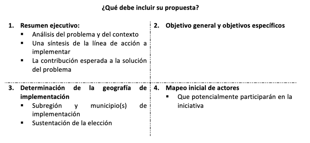 Las iniciativas o proyectos deben ser para implementarse en una o varias de las 7 subregiones y 21 municipios priorizados por el Programa y deben tener una vigencia o tiempo de ejecución entre 6 y 12 meses.