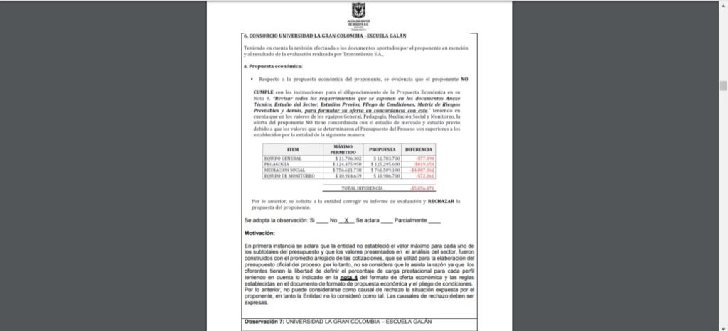 La Corporación Escuela Galán fue una de las que subsanó su propuesta, dado que no presentó el formato N° 09, correspondiente a las obligaciones tributarias de cada de una de las entidades sin ánimo de lucro que conforman el consorcio firmado por su representante legal (numeral 2.1.2.1). Finalmente, la Corporación Galán ganó la licitación con un puntaje de 99,6236, muy cerca de otros dos de los proponentes que obtuvieron 99,577 y 99,516 puntos respectivamente.