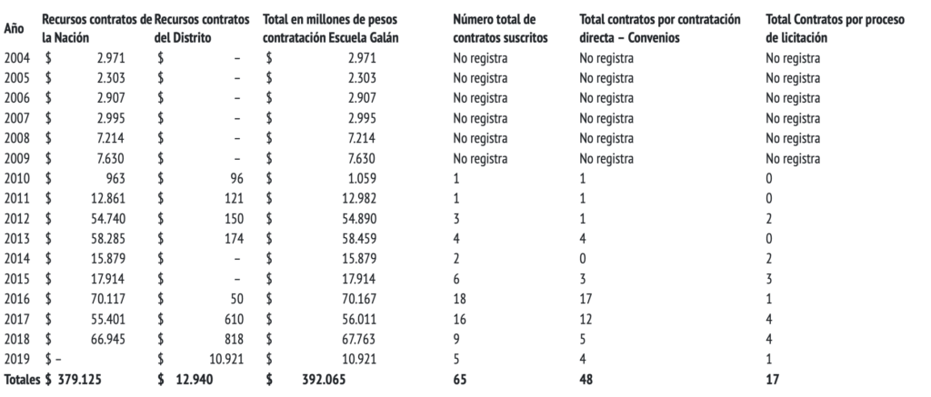 Desde su creación hasta hoy, la Escuela Galán para el desarrollo ha manejado poco menos de medio billón de pesos en recursos públicos a través de contratos otorgados, en su mayoría, por contratación directa. En efecto, desde que se tiene registro, la Corporación Escuela Galán ha suscrito 45 contratos de modalidad de contratación directa o convenios interadministrativos, mientras por licitación ha alcanzado 17 (Cuadro n°1), es decir, el 73% de la contratación con el estado le ha sido adjudicada sin mediar proceso de competencia previa.