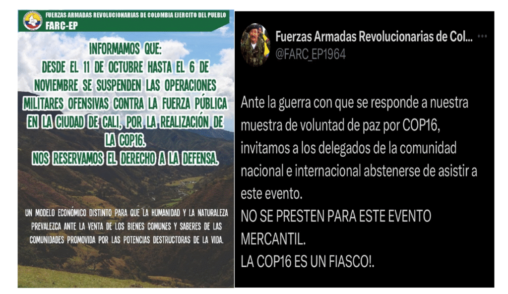 Sin embargo, tras el desarrollo de la Operación Perseo, desarrollada en el municipio de corregimiento de El Plateado, en el municipio de Argelia, la cual tiene como objetivo “recuperar, estabilizar y proteger la zona urbana de El Plateado, en Argelia, Cauca, afectada por la violencia y el narcotráfico”. El EMC, nuevamente a través de cuenta de X, el sábado 12 de octubre, hizo un llamado a los delegados y asistentes a la COP, a abstenerse de participar del evento.