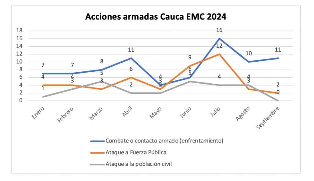 Los combates y hostigamientos entre actores armados incrementaron significativamente tras el levantamiento del cese al fuego por parte del gobierno nacional el 20 de marzo en los departamentos de Cauca, Valle del Cauca y Nariño con la facción liderada por Iván Mordico. A pesar de que los combates también ocurrían durante el cese al fuego, el ambiente de zozobra se intensificó. Se observó un aumento en los casos de secuestros y desapariciones, lo que indicaba un deterioro en las condiciones de cuidado territorial y las prácticas bélicas de los grupos armados. Asimismo, el número de artefactos explosivos encontrados cerca de áreas comunitarias y educativas representaba una creciente preocupación. Las comunidades intentaron establecer estrategias de desminado humanitario, pero las condiciones del conflicto dificultaron su implementación efectiva. También se reportaron desplazamientos y confinamientos de familias debido a los combates, destacando graves infracciones al Derecho Internacional Humanitario, como el daño a espacios comunitarios en territorios indígenas (Çxhab Wala Kiwe, 2024).