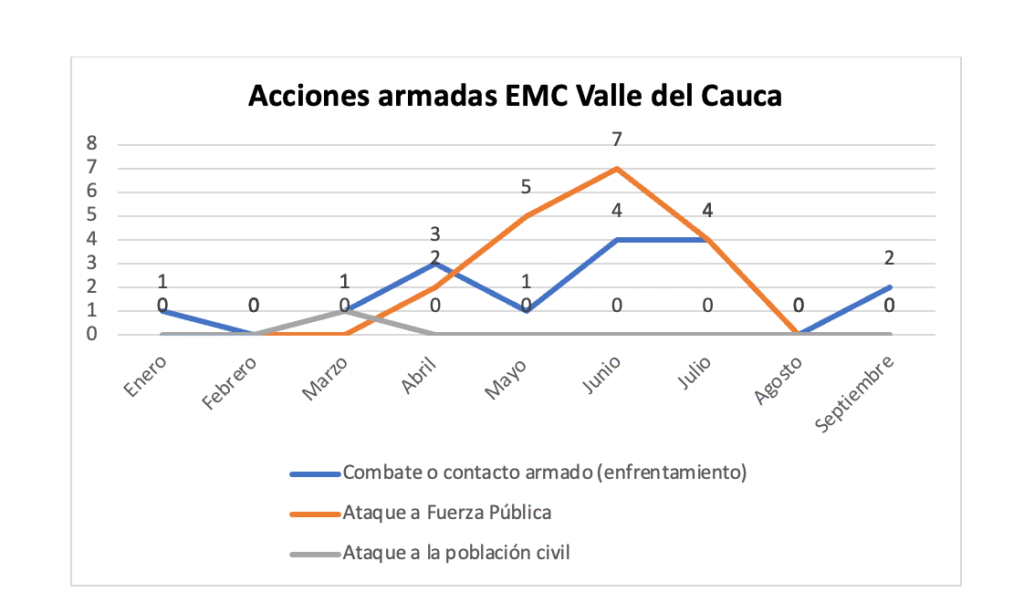 En comparación con el Cauca, el Valle del Cauca presenta un escenario menos violento, pero no exento de riesgos. Estructuras como el Frente Jaime Martínez y el Frente Adán Izquierdo del EMC han realizado acciones armadas, principalmente en municipios como Sevilla, Pradera, Jamundí y Tuluá. Estas acciones, aunque limitadas en número, han implicado ataques a la Fuerza Pública y enfrentamientos que, si bien no han dejado víctimas fatales para el caso de la ciudad de Cali, generan una sensación de inseguridad en las áreas circundantes.