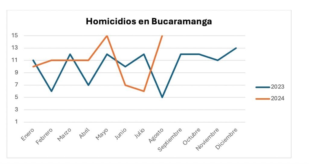 Según datos del SIEDCO, entre enero y agosto de 2023 se presentaron 75 homicidios en Bucaramanga, mientras que durante el mismo periodo en 2024 van 86 homicidios lo que quiere decir que estos han aumentado en un 14.6% durante este año. Esta tendencia de aumento en los homicidios parece responder a la oleada de sicariatos fruto de los nuevos enfrentamientos entre Grupos de Delincuencia Organizada por el control de los territorios urbanos y que se viene viendo al menos desde el mes de mayo.