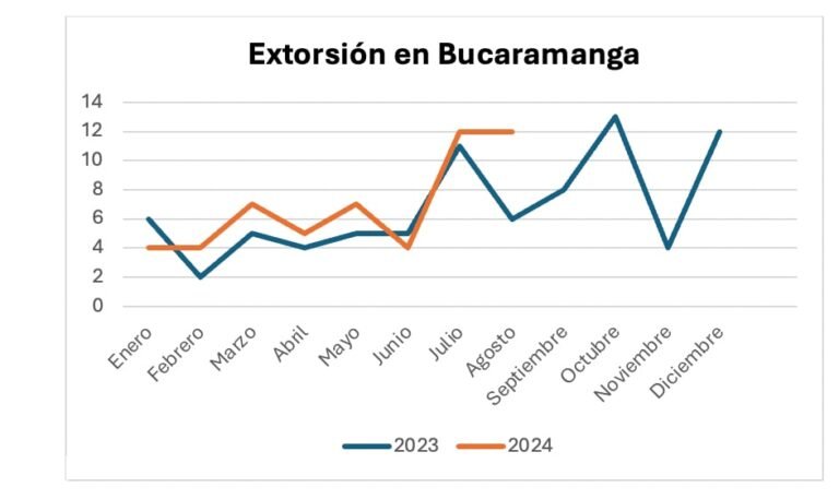 Sin embargo, este no es el único dato preocupante. Entre enero y agosto de 2023 se presentaron 44 casos de extorsión en Bucaramanga, mientras que durante el mismo periodo en 2024 van 55 casos lo que quiere decir que esta ha aumentado en un 25%.