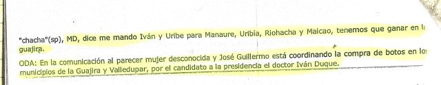 Por otra parte, en una de las grabaciones de las conversaciones se oye cuando ´Ñeñe´ revela que también robó dineros que eran para comprarle votos en la costa norte a Germán Vargas Lleras en la primera vuelta y, al parecer, los destinó a comprárselos a Duque en la segunda vuelta electoral.