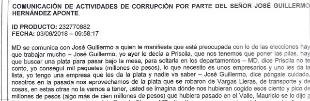 En las conversaciones de `Ñeñe` Hernández con Priscilla dejan saber que son más de mil millones de pesos lo concerniente a una entrega de dinero y él explica que es el encargado de conseguir empresarios para comprometerlos con la compra de votos para Iván Duque. Esos mil millones de pesos Priscilla, al parecer, los recibió de alguien llamado Mauricio.