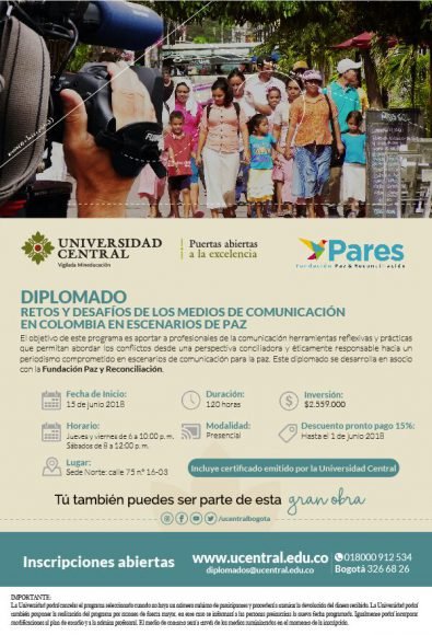 La Fundación Paz y Reconciliación-Pares en alianza con la Universidad Central, impartirán el diplomado “Retos y desafíos de los medios de comunicación en Colombia en escenarios de paz” con el fin de aportar a profesionales de la comunicación herramientas reflexivas y prácticas que les permitan abordar los conflictos desde una perspectiva conciliadora y éticamente responsable.