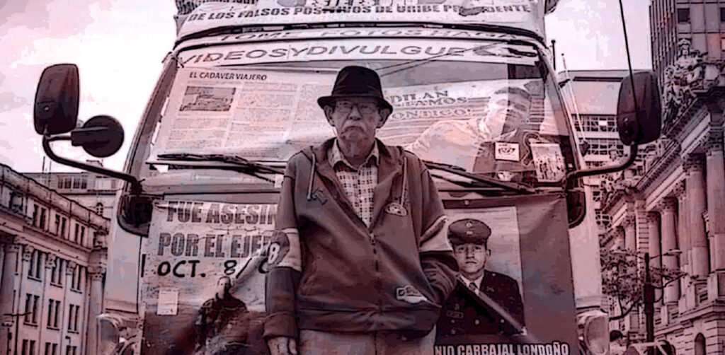 La historia de Don Raúl es la de la persistencia de las víctimas, las que son capaces de aguantar los martirios que sean necesarios con tal de que se haga justicia, o que al menos el país conozca el caso donde murió el ser amado. Don Raúl se hizo a un costado del congreso con su camión, al que lleno de afiches. Uno de ellos eran tres fotos. En la primera decía “Así ingresó” y aparecía la foto del cabo cuando recién entró al ejército. “Así me lo entregaron” y era la foto del rostro después de la muerte. Y en la tercera rezaba “Estos son los responsables” y se veían entonces a Juan Manuel Santos, siendo ministro de defensa, conversando con su jefe directo Álvaro Uribe Vélez, principales responsables, por línea de mando, de lo que sucedió con los Falsos Positivos. La tenacidad de Don Raúl se hizo mundialmente conocida. Él estaba ahí para contarle la historia de su hijo a todo aquel que quisiera escucharla. Decidió estar ahí, vivir en la estrechez de su auto. Y eso hizo hasta el 2021, cuando un coma diabético se lo llevó a los 73 años. Se quedó esperando una sentencia, una disculpa de Santos o de Uribe. El caso de su hijo es la otra cara de los Falsos Positivos. Su hija Doris ha tomado la posta. No descansará hasta saber la verdad de lo que pasó con el Mono.