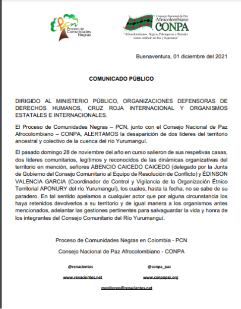 Al cumplirse 04 días de su desaparición, y al no obtener ninguna respuesta, el Consejo Nacional de Paz Afrocolombiano, CONPAZ, y el Proceso de Comunidades Negras, PCN, elevaron la denuncia para que organismos estatales e instancias nacionales e internacionales tomen, prontamente, las medidas necesarias para que Abencio y Edison puedan volver con vida a sus territorios.