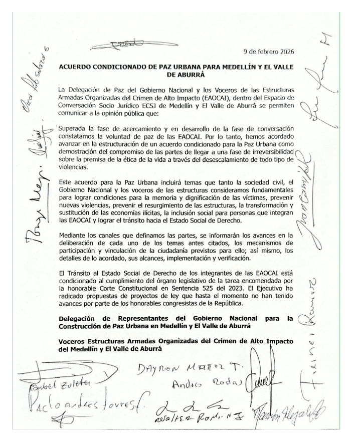 Días después, la delegación anunció la firma de un “acuerdo condicionado” que buscaría dar garantías de irreversibilidad a lo avanzado hasta ahora. De acuerdo con Isabel Cristina Zuleta, jefa delegada del Gobierno en el proceso, el propósito de este acuerdo apunta a blindar los compromisos de reducción de violencias y lograr la irreversibilidad del proceso, ante la ausencia de una ley de sometimiento.
