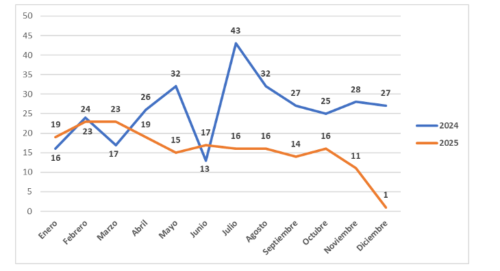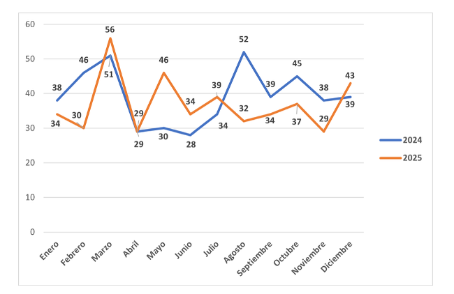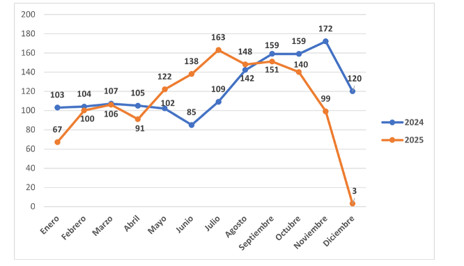 Sin bien se pueden evidenciar disminuciones en las cifras de violencia, como en el caso de los homicidios que se redujeron un 5,5 % con respecto a 2024, se mantiene una tendencia similar de picos y disminuciones a lo largo del año, y con un incremento en el mes de diciembre –que eventualmente podría ser explicado por riñas y otras situaciones derivadas-.