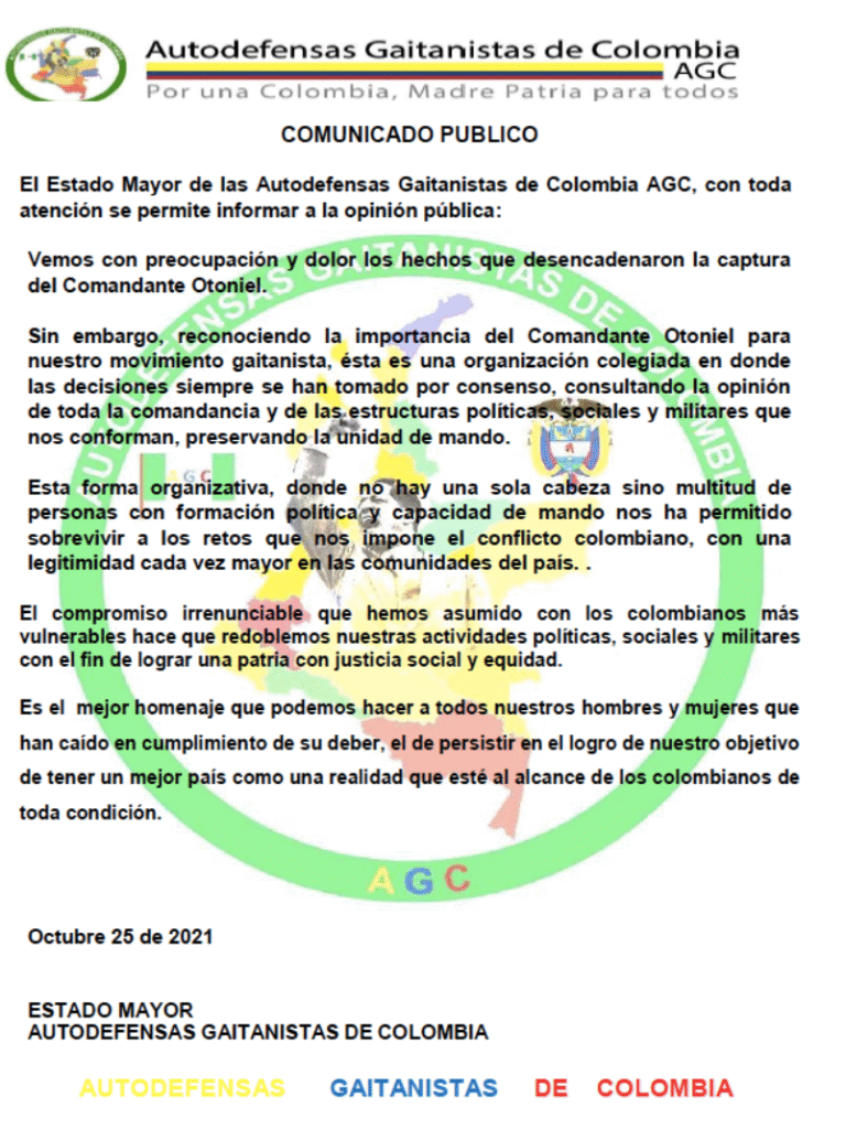 Ahora bien, a través de Whatsapp está circulando un supuesto comunicado del Comando Central de las Autodefensas Gaitanistas de Colombia, cuya veracidad debe ser comprobada, en donde se afirma que mantienen su accionar en los distintos territorios del país dada su composición organizacional, es decir, en razón de su estructura de mando descentralizada: